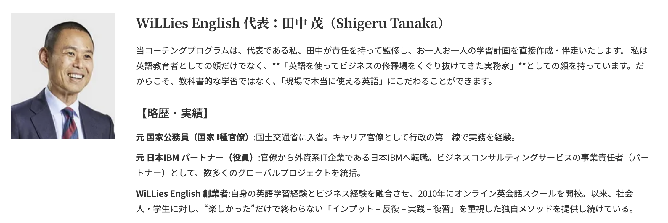 契約するまで担当者がわからないガチャはありません。これまで2万人以上の英語脳を作り上げてきたWiLLies Englishのメソッド開発者である代表(田中)自身が、あなたを直接コーチングします。 個人の生徒様だけでなく、大手航空会社や製造業、外資系企業の社員研修も手掛け、年間100人以上の生徒様に直接コーチングを提供している英語指導のプロフェッショナルです。