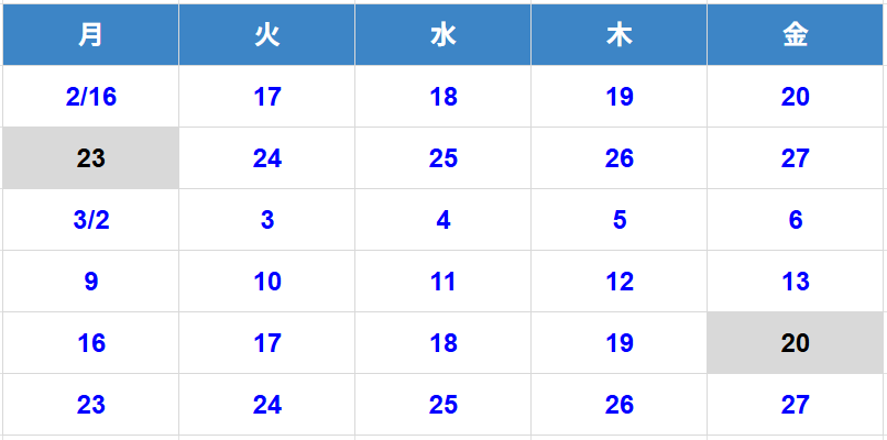 ▷ お休み:2/23(月)、3/20(金)