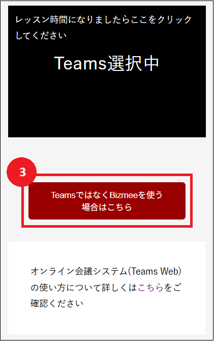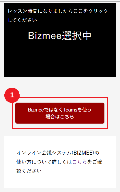 ・レッスン開始直前にBIZMEE ⇔ Teamsの切り替えをされると、講師が別のツールに既に入室している場合があります。オンライン通話システムの変更は、可能な限り黒いウィンドウが点滅する前に実施してください。