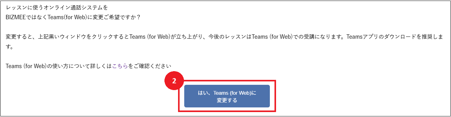 確認画面が表示されますので、確認後②「はい、Teams (for web)に変更する」ボタンをクリックします。