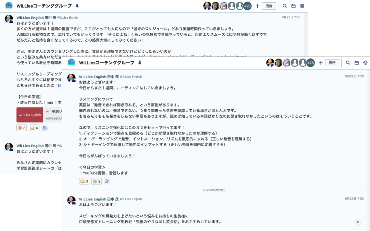 コーチとの日々のコミュニケーションだけでなく、同じプログラムで学ぶ生徒同士のグループがあります。ここでは他の生徒の良い学習方法を学びあい、悩みや成果を共有しています。コーチからではなく、同じ目標を持つ生徒から受ける刺激は学習の質を高め、継続意欲を高めてくれます。「4. コーチングプログラム後も学べる環境があること」