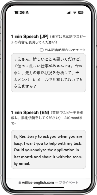 - 1minSpeech教材で、一人一人オリジナルのスピーキング教材を作成しオーバーラッピングと音読で反復します