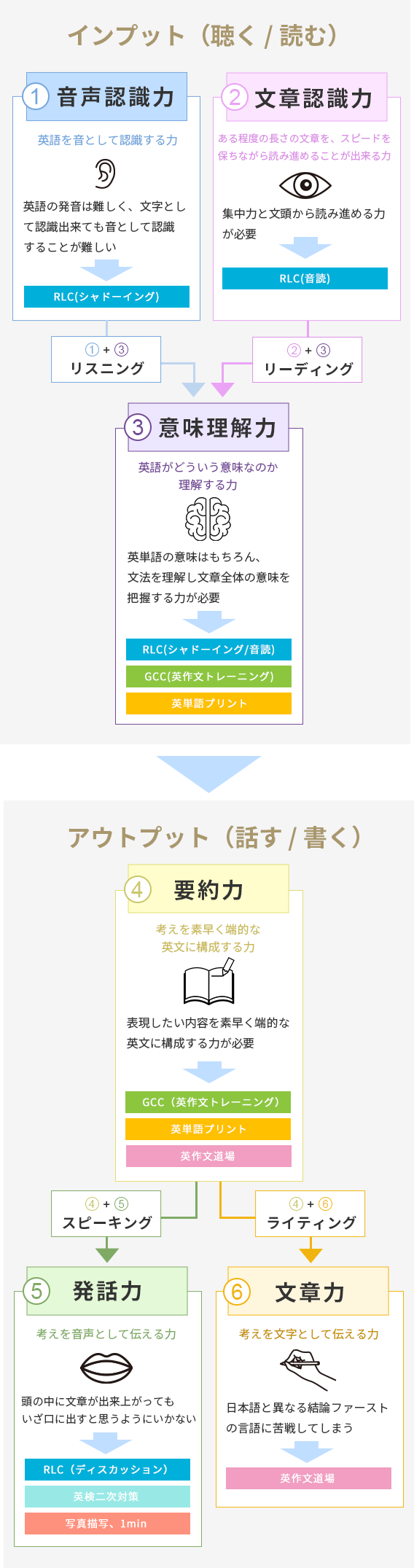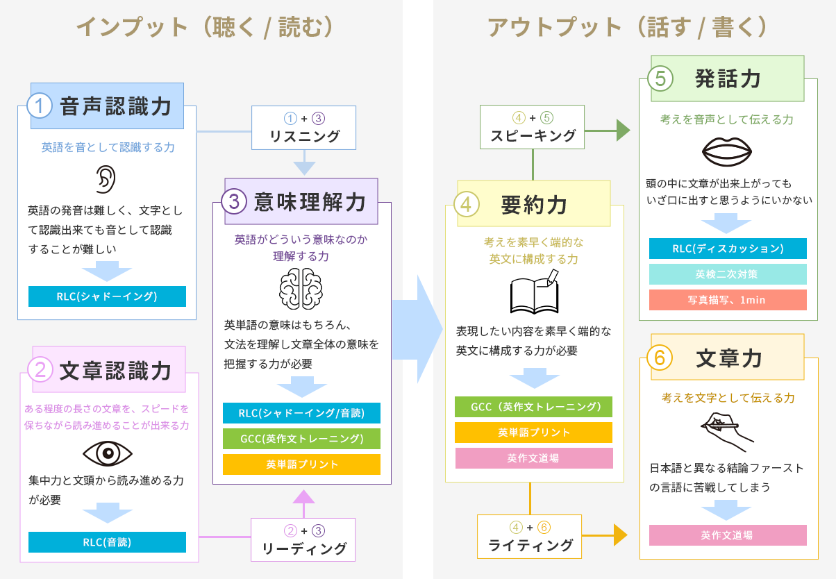 RLC(Reading, Listening and Conversation)トレーニングは、リスニング力、リーディング力などインプット力を高めるためのトレーニングです。RLCでは音読・リピーティング・シャドーイングを行います。